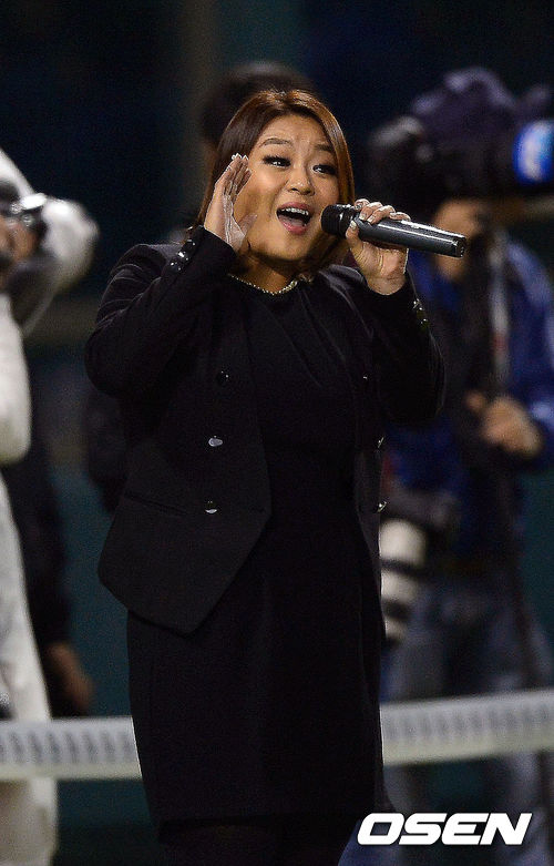 29일 오후 서울 잠실구장에서 열리는 '2013 한국야쿠르트 세븐 프로야구' 한국시리즈 5차전 두산 베어스와 삼성 라이온즈의 경기에 앞서 가수 이영헌이 애국가를 부르고 있다.