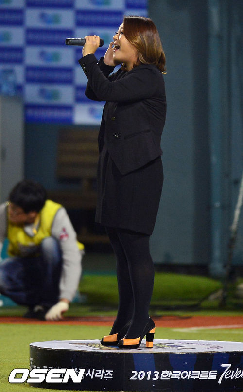 29일 오후 서울 잠실구장에서 열리는 '2013 한국야쿠르트 세븐 프로야구' 한국시리즈 5차전 두산 베어스와 삼성 라이온즈의 경기, 경기 전 가수 이영현이 열창을 하고 있다.