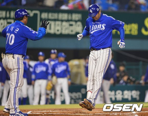 29일 오후 서울 잠실구장에서 열린 '2013 한국야쿠르트 세븐 프로야구' 한국시리즈 5차전 두산 베어스와 삼성 라이온즈의 경기, 1회초 삼성 공격 2사 주자없는 상황 3번 채태인이 좌월 솔로포를 날리고 홈 베이스를 밟고 있다.