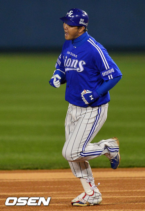 29일 오후 서울 잠실구장에서 열리는 '2013 한국야쿠르트 세븐 프로야구' 한국시리즈 5차전 두산 베어스와 삼성 라이온즈의 경기, 1회초 2사 주자 없는 상황에서 삼성 채태인이 선취 솔로 홈런을 날린 후 그라운드를 돌며 환호하고 있다.