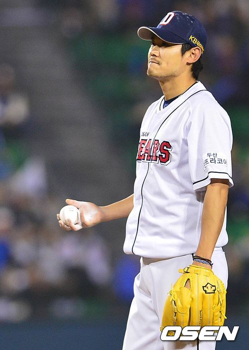 29일 오후 서울 잠실구장에서 열린 '2013 한국야쿠르트 세븐 프로야구' 한국시리즈 5차전 두산 베어스와 삼성 라이온즈의 경기, 1회초 삼성 공격 2사 1, 3루 상황 박석민에게 1타점 우전안타를 허용한 두산 선발 노경은이 아쉬워하고 있다.