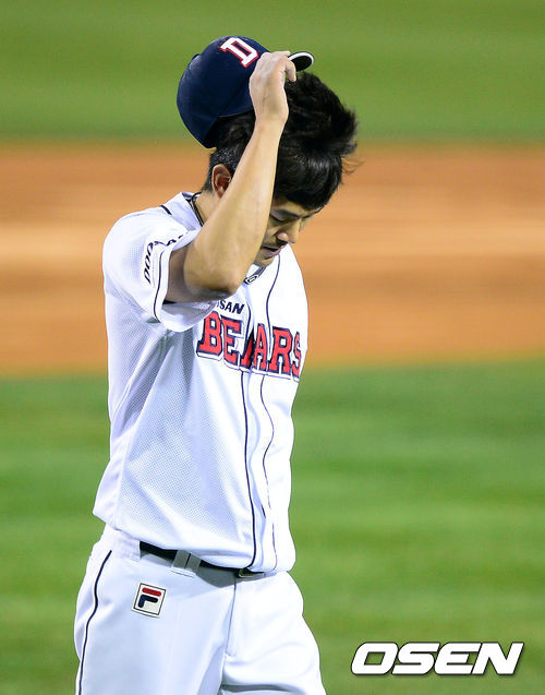 29일 오후 서울 잠실구장에서 열린 '2013 한국야쿠르트 세븐 프로야구' 한국시리즈 5차전 두산 베어스와 삼성 라이온즈의 경기, 1회초 수비에서 3실점을 허용한 두산 노경은이 수비를 마치고 아쉬운 표정을 지으며 더그아웃으로 향하고 있다.