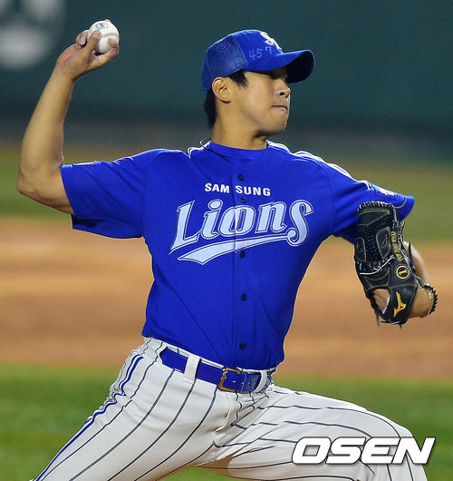 29일 오후 서울 잠실구장에서 열리는 '2013 한국야쿠르트 세븐 프로야구' 한국시리즈 5차전 두산 베어스와 삼성 라이온즈의 경기, 삼성 선발 윤성환이 힘차게 공을 뿌리고 있다.