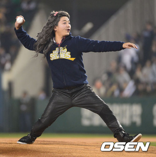 29일 오후 서울 잠실구장에서 열린 '2013 한국야쿠르트 세븐 프로야구' 한국시리즈 5차전 두산 베어스와 삼성 라이온즈의 경기, 시구자로 나선 개그맨 김준호가 재미있는 자세로 공을 던질 준비를 하고 있다.