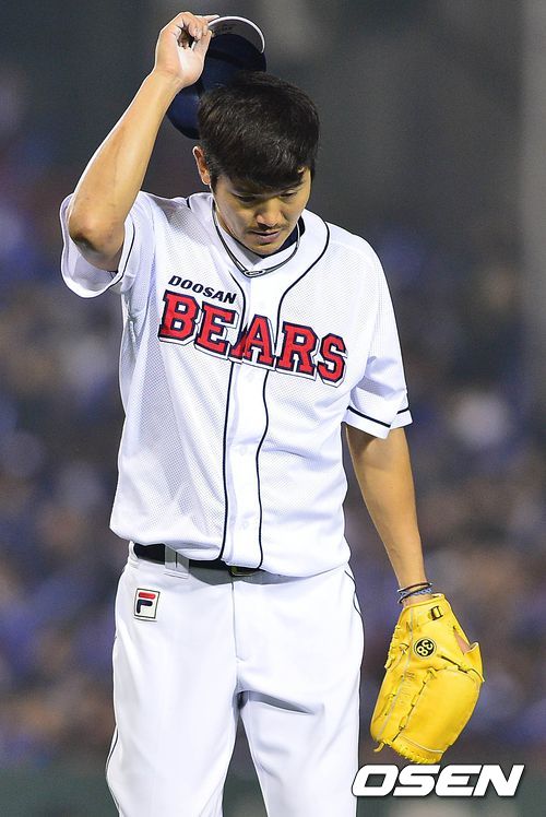 29일 오후 서울 잠실구장에서 열린 '2013 한국야쿠르트 세븐 프로야구' 한국시리즈 5차전 두산 베어스와 삼성 라이온즈의 경기, 1회초 삼성 공격에서 3실점한 두산 선발 노경은이 이닝을 마치고 더그아웃으로 들어오며 모자를 벗고 있다.