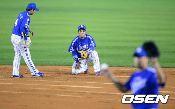 29일 오후 서울 잠실구장에서 열린 '2013 한국야쿠르트 세븐 프로야구' 한국시리즈 5차전 두산 베어스와 삼성 라이온즈의 경기, 1회말 1사에서 삼성 김태완이 두산 정수빈의 2루 땅볼 타구를 몸날려 잡았지만 1루에서 정수빈이 헤드퍼스트 슬라이딩으로 세이프되자 아쉬워하고 있다.
