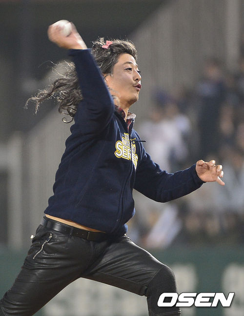 29일 오후 서울 잠실구장에서 열린 '2013 한국야쿠르트 세븐 프로야구' 한국시리즈 5차전 두산 베어스와 삼성 라이온즈의 경기, 시구자로 나선 개그맨 김준호가 재미있는 자세로 공을 던질 준비를 하고 있다.