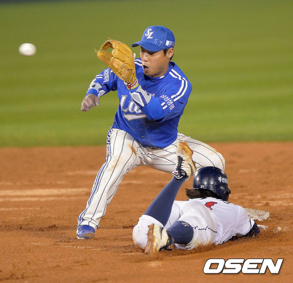 29일 오후 서울 잠실구장에서 열리는 '2013 한국야쿠르트 세븐 프로야구' 한국시리즈 5차전 두산 베어스와 삼성 라이온즈의 경기, 1회말 2사 1루 최준석 타석때 1루 주자 정수빈 2루 도루를 하였으나 태그아웃 처리되고 있다.