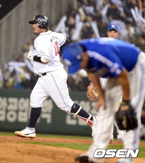 29일 오후 서울 잠실구장에서 열리는 '2013 한국야쿠르트 세븐 프로야구' 한국시리즈 5차전 두산 베어스와 삼성 라이온즈의 경기, 2회말 무사 최준석이 솔로 홈런을 치고 베이스를 돌고 있다.