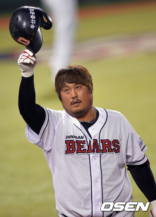 29일 오후 서울 잠실구장에서 열리는 '2013 한국야쿠르트 세븐 프로야구' 한국시리즈 5차전 두산 베어스와 삼성 라이온즈의 경기, 2회말 선두타자 최준석 좌월솔로 홈런을 날리고 홈인 팬들에게 인사를 하고 있다.