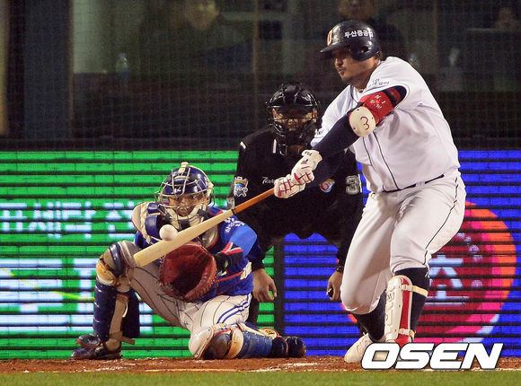 29일 오후 서울 잠실구장에서 열린 '2013 한국야쿠르트 세븐 프로야구' 한국시리즈 5차전 두산 베어스와 삼성 라이온즈의 경기 2회말 선두타자 최준석이 솔로포를 치고 있다.