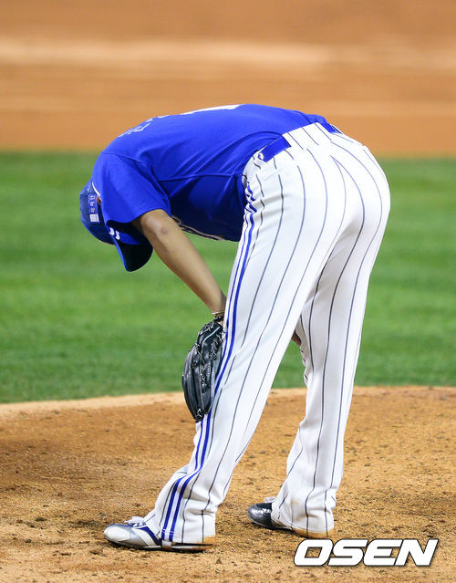 29일 오후 서울 잠실구장에서 열린 '2013 한국야쿠르트 세븐 프로야구' 한국시리즈 5차전 두산 베어스와 삼성 라이온즈의 경기, 2회말 무사에서 삼성 윤성환이 두산 최준석에 솔로포를 허용하고 아쉬워하고 있다.