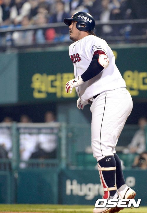 29일 오후 서울 잠실구장에서 열리는 '2013 한국야쿠르트 세븐 프로야구' 한국시리즈 5차전 두산 베어스와 삼성 라이온즈의 경기, 2회말 무사 최준석이 솔로 홈런을 치고 타구를 바라보고 있다.