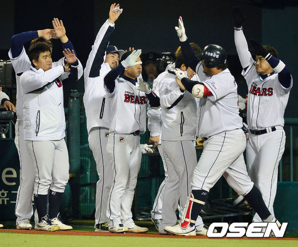 29일 오후 서울 잠실구장에서 열리는 '2013 한국야쿠르트 세븐 프로야구' 한국시리즈 5차전 두산 베어스와 삼성 라이온즈의 경기, 2회말 선두타자 두산 최준석이 좌월 솔로 홈런을 날린 후 덕아웃에서 동료들과 기쁨을 나누고 있다.