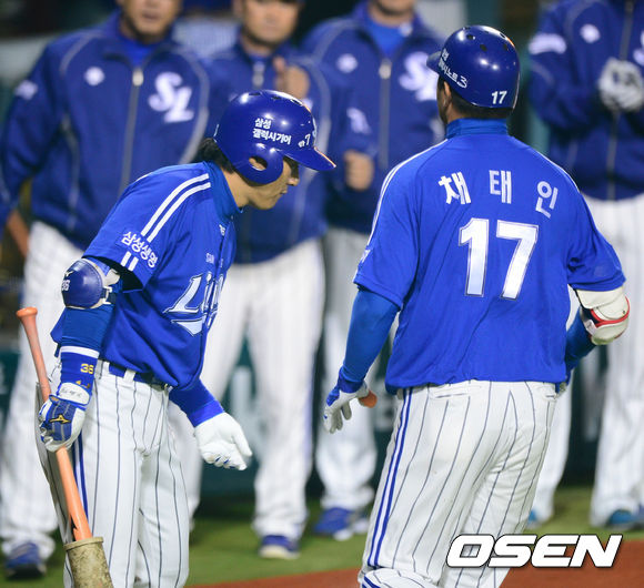 29일 오후 서울 잠실구장에서 열린 '2013 한국야쿠르트 세븐 프로야구' 한국시리즈 5차전 두산 베어스와 삼성 라이온즈의 경기, 1회초 2사 삼성 채태인이 선취 솔로홈런을 날린후 이승엽과 하이파이브를 하고 있다.