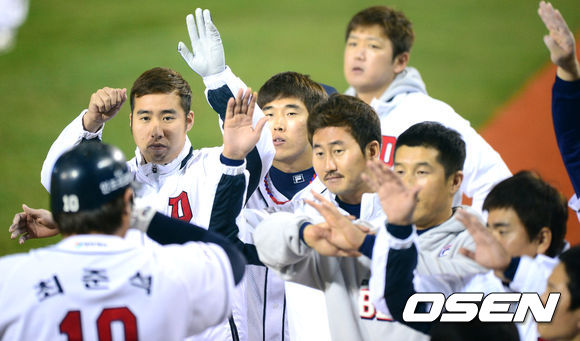 29일 오후 서울 잠실구장에서 열린 '2013 한국야쿠르트 세븐 프로야구' 한국시리즈 5차전 두산 베어스와 삼성 라이온즈의 경기, 2회말 무사에서 두산 최준석이 솔로포를 날리고 더그아웃에서 동료선수들과 기뻐하고 있다.