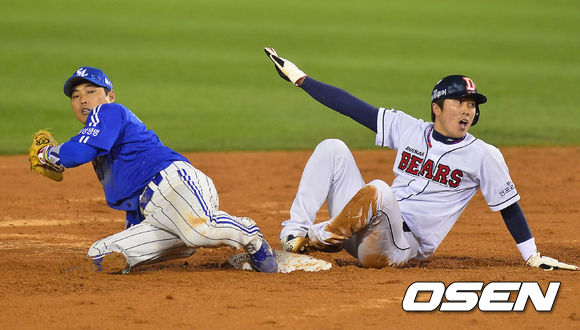 29일 오후 서울 잠실구장에서 열리는 '2013 한국야쿠르트 세븐 프로야구' 한국시리즈 5차전 두산 베어스와 삼성 라이온즈의 경기, 2회말 2사 주자 1,2루 두산 김재호의 유격수 앞 땅볼때 1루 주자 허경민이 2루에서 포스아웃을 당하고 있다.