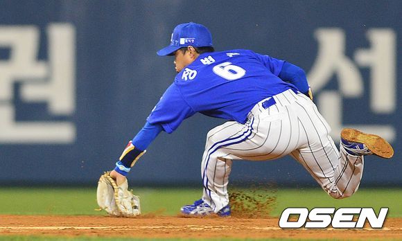 29일 오후 서울 잠실구장에서 열린 '2013 한국야쿠르트 세븐 프로야구' 한국시리즈 5차전 두산 베어스와 삼성 라이온즈의 경기, 2회말 두산 공격 2사 1, 2루 상황 김재호의 내야땅볼 타구를 삼성 유격수 정병곤이 멋지게 잡아내고 있다. 이어진 2루송구에서 1루주자를 아웃시키며 이닝 종료.