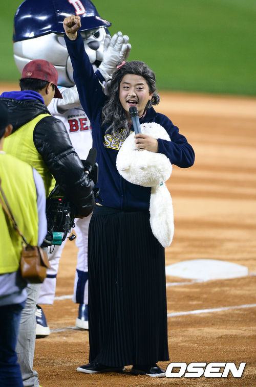 29일 오후 서울 잠실구장에서 열린 '2013 한국야쿠르트 세븐 프로야구' 한국시리즈 5차전 두산 베어스와 삼성 라이온즈의 경기, 경기에 앞서 시구 나서는 개그맨 김준호가 파이팅을 외치고 있다