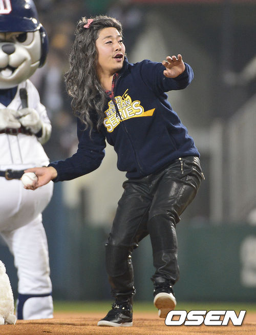 29일 오후 서울 잠실구장에서 열린 '2013 한국야쿠르트 세븐 프로야구' 한국시리즈 5차전 두산 베어스와 삼성 라이온즈의 경기에 앞서 개그맨 김준호가 시구를 하고 있다