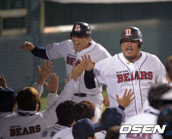 29일 오후 서울 잠실구장에서 열리는 '2013 한국야쿠르트 세븐 프로야구' 한국시리즈 5차전 두산 베어스와 삼성 라이온즈의 경기, 3회말 1사 1,2루 오재일의 2타점 적시타때 1루주자 최준석 득점을 올리며 환호하고 있다.