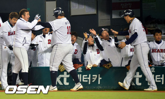 29일 오후 서울 잠실구장에서 열리는 '2013 한국야쿠르트 세븐 프로야구' 한국시리즈 5차전 두산 베어스와 삼성 라이온즈의 경기, 3회초 1사 주자 1,2루 두산 오재일의 좌중간 동점 2타점 적시타때 홈을 밟은 최준석과 김현수가 덕아웃에서 동료들과 하이파이브를 하고 있다.
