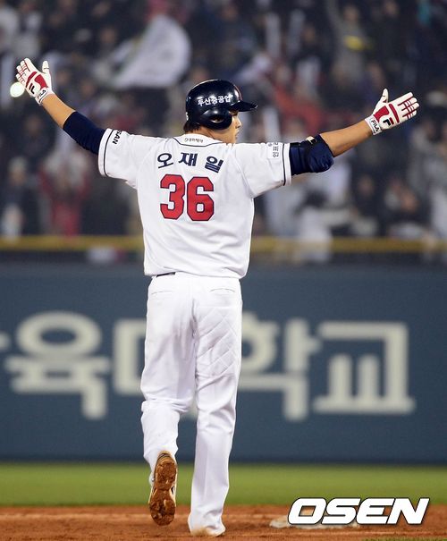 29일 오후 서울 잠실구장에서 열리는 '2013 한국야쿠르트 세븐 프로야구' 한국시리즈 5차전 두산 베어스와 삼성 라이온즈의 경기, 3회말 1사 1,2루 오재일이 동점 2루타를 치고 있다.