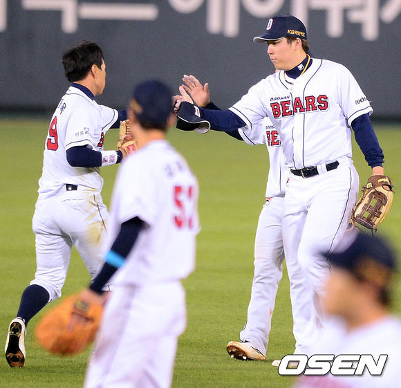 29일 오후 서울 잠실구장에서 열린 '2013 한국야쿠르트 세븐 프로야구' 한국시리즈 5차전 두산 베어스와 삼성 라이온즈의 경기, 4회초 1사 두산 이종욱 중견수가 삼성 정병곤의 타구를 호수비 펼치며 잡아낸후 김현수와 하이파이브를 하고 있다