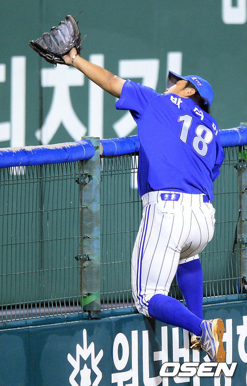 29일 오후 서울 잠실구장에서 열린 '2013 한국야쿠르트 세븐 프로야구' 한국시리즈 5차전 두산 베어스와 삼성 라이온즈의 경기, 3회말 1사 1,2루 두산 오재일의 파울타구를 삼성 박석민이 팔을 뻗어 포구 시도하고 있다.