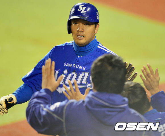 29일 오후 서울 잠실구장에서 열린 '2013 한국야쿠르트 세븐 프로야구' 한국시리즈 5차전 두산 베어스와 삼성 라이온즈의 경기, 5회초 2사 주자 1,2루 삼성 박석민이 중견수 앞 1타점 적시타때 홈을 밟은 채태인이 덕아웃에서 동료들과 하이파이브를 하고 있다.