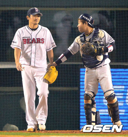 29일 오후 서울 잠실구장에서 열린 '2013 한국야쿠르트 세븐 프로야구' 한국시리즈 5차전 두산 베어스와 삼성 라이온즈의 경기 5회초 2사 1,2루 박석민에게 1타점 2루타를 내준 노경은이 양의지로부터 격려를 받고 있다.