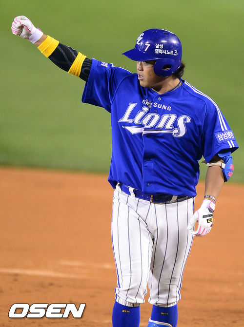 29일 오후 서울 잠실구장에서 열린 '2013 한국야쿠르트 세븐 프로야구' 한국시리즈 5차전 두산 베어스와 삼성 라이온즈의 경기, 5회초 2사 1,2루 삼성 박석민이 재역전 1타점 적시타를 날리고 환호하고 있다.