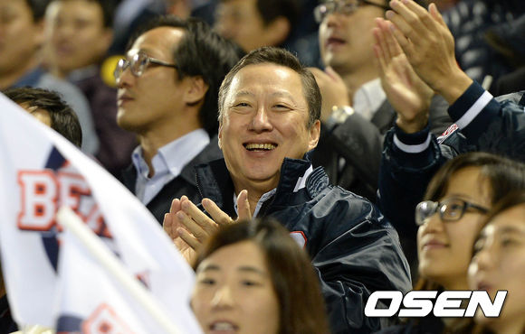 29일 오후 서울 잠실구장에서 열리는 '2013 한국야쿠르트 세븐 프로야구' 한국시리즈 5차전 두산 베어스와 삼성 라이온즈의 경기, 2회말 무사에서 두산 최준석의 솔로 홈런 때 경기장을 찾은 박용만 두산그룹 회장이 환호하고 있다.