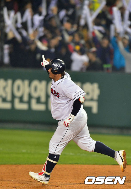 29일 오후 서울 잠실구장에서 열린 '2013 한국야쿠르트 세븐 프로야구' 한국시리즈 5차전 두산 베어스와 삼성 라이온즈의 경기, 5회말 2사 주자 없는 상황에서 두산 최준석이 동점 솔로 홈런을 날린 후 그라운드를 돌고 있다.