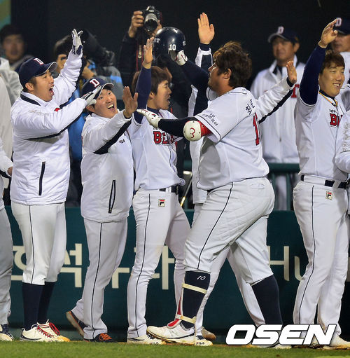 29일 오후 서울 잠실구장에서 열린 '2013 한국야쿠르트 세븐 프로야구' 한국시리즈 5차전 두산 베어스와 삼성 라이온즈의 경기, 5회말 2사 주자 없는 상황에서 두산 최준석이 동점 솔로 홈런을 날린 후 덕아웃에서 동료들과 하이파이브를 하고 있다.