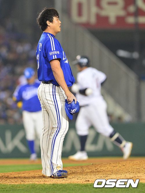 29일 오후 서울 잠실구장에서 열린 '2013 한국야쿠르트 세븐 프로야구' 한국시리즈 5차전 두산 베어스와 삼성 라이온즈의 경기, 5회말 두산 공격 2사 주자없는 상황 최준석에게 동점 우월 솔로포를 허용한 삼성 투수 안지만이 아쉬워하고 있다.