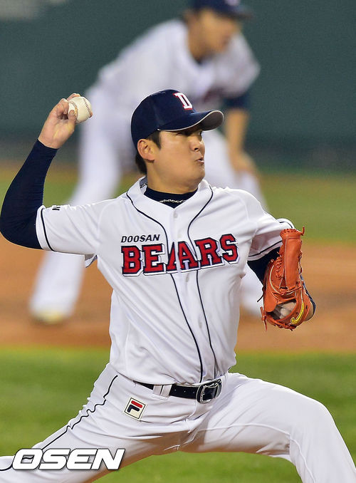 29일 오후 서울 잠실구장에서 열린 '2013 한국야쿠르트 세븐 프로야구' 한국시리즈 5차전 두산 베어스와 삼성 라이온즈의 경기, 6회초 두산 노경은 대신 마운드에 오른 김선우가 힘차게 공을 뿌리고 있다.