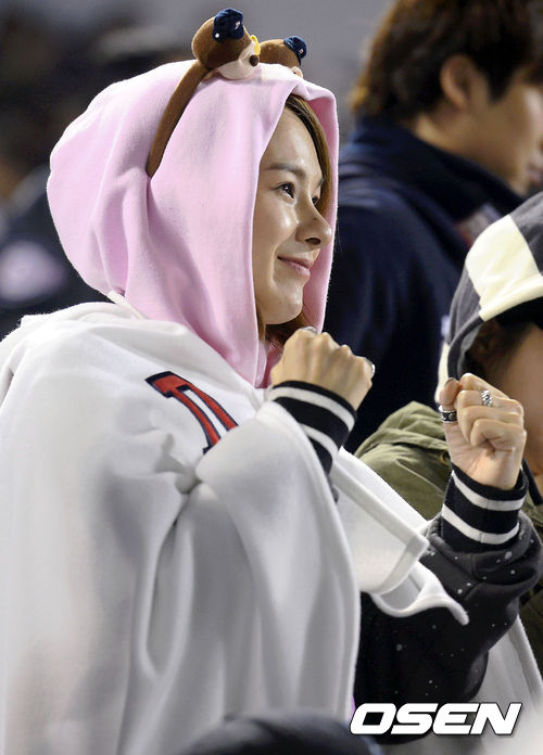 29일 오후 서울 잠실구장에서 열린 '2013 한국야쿠르트 세븐 프로야구' 한국시리즈 5차전 두산 베어스와 삼성 라이온즈의 경기, 가수 채연이 야구 관람을 하고 있다.