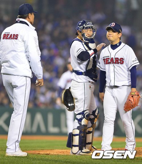 29일 오후 서울 잠실구장에서 열린 '2013 한국야쿠르트 세븐 프로야구' 한국시리즈 5차전 두산 베어스와 삼성 라이온즈의 경기, 8회초 삼성 공격 무사 1루 상황 두산 투수 윤명준이 마운드를 내려가고 있다.