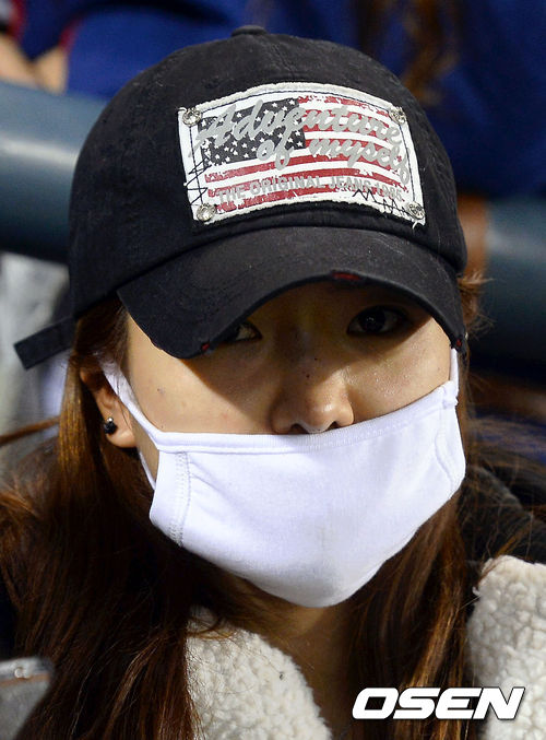 29일 오후 서울 잠실구장에서 열린 '2013 한국야쿠르트 세븐 프로야구' 한국시리즈 5차전 두산 베어스와 삼성 라이온즈의 경기, 골퍼 안신애가 야구 관람을 하고 있다.