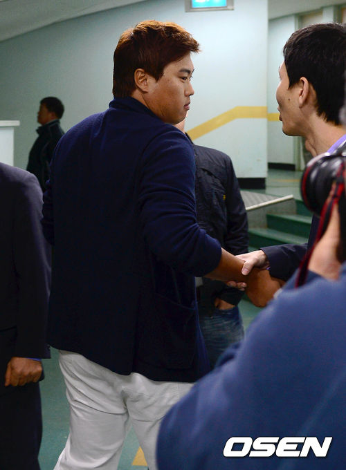 29일 오후 서울 잠실구장에서 열리는 '2013 한국야쿠르트 세븐 프로야구' 한국시리즈 5차전 두산 베어스와 삼성 라이온즈의 경기, 잠실야구장을 찾은 LA다저스 류현진이 관계자들과 이야기를 나누고 있다.