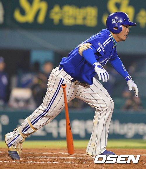 29일 오후 서울 잠실구장에서 열린 '2013 한국야쿠르트 세븐 프로야구' 한국시리즈 5차전 두산 베어스와 삼성 라이온즈의 경기, 6회초 삼성 공격 1사 2, 3루 상황 박한이가 2타점 우전 적시타를 날리고 있다.