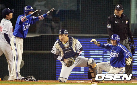 29일 오후 서울 잠실구장에서 열린 '2013 한국야쿠르트 세븐 프로야구' 한국시리즈 5차전 두산 베어스와 삼성 라이온즈의 경기 8회초 1사 2,3루 박한이의 2타점 적시타에 정병곤이 홈에서 세이프되고 있다.