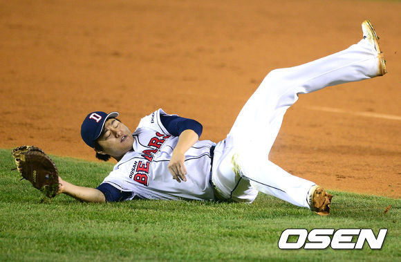 29일 오후 서울 잠실구장에서 열린 '2013 한국야쿠르트 세븐 프로야구' 한국시리즈 5차전 두산 베어스와 삼성 라이온즈의 경기, 8회초 1사 1,3루에서 두산 오재일이 삼성 박한이의 2타점 우전 적시타 타구에 몸을 날렸지만 놓치고 아쉬워하고 있다.