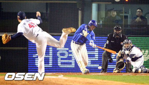 29일 오후 서울 잠실구장에서 열린 '2013 한국야쿠르트 세븐 프로야구' 한국시리즈 5차전 두산 베어스와 삼성 라이온즈의 경기 8회초 1사 2,3루 박한이가 2타점 적시타를 치고 있다.
