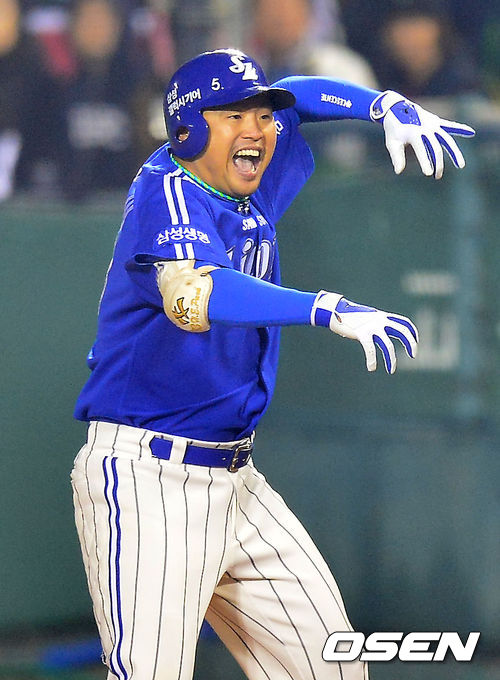 29일 오후 서울 잠실구장에서 열린 '2013 한국야쿠르트 세븐 프로야구' 한국시리즈 5차전 두산 베어스와 삼성 라이온즈의 경기, 8회초 1사 주자 2,3루 삼성 박한이 우익수 앞 2타점 적시타를 날린 후 기뻐하고 있다.