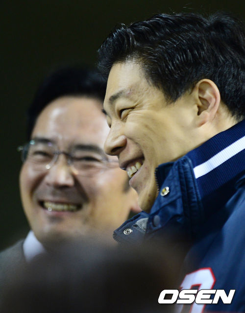29일 오후 서울 잠실구장에서 열린 '2013 한국야쿠르트 세븐 프로야구' 한국시리즈 5차전 두산 베어스와 삼성 라이온즈의 경기, 이재용 삼성전자 부회장이 박진원 두산 사장과 인사를 나누고 있다.
