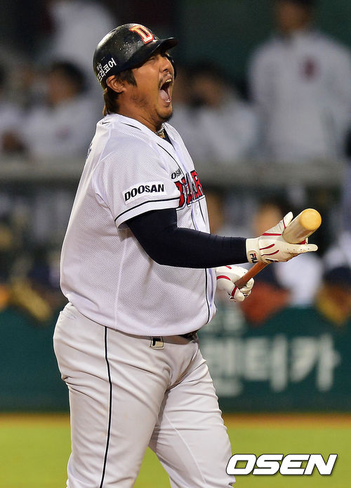 29일 오후 서울 잠실구장에서 열린 '2013 한국야쿠르트 세븐 프로야구' 한국시리즈 5차전 두산 베어스와 삼성 라이온즈의 경기, 8회말 무사 주자 1루 두산 최준석이 헛스윙을 한 후 아쉬워하고 있다.
