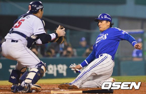 29일 오후 서울 잠실구장에서 열린 '2013 한국야쿠르트 세븐 프로야구' 한국시리즈 5차전 두산 베어스와 삼성 라이온즈의 경기, 9회초 삼성 공격 1사 1, 3루 상황 이지영의 스퀴츠 번트 때 홈으로 내달린 3루주자 이승엽이 홈에서 양의지의 태그에 걸려 아웃되고 있다.
