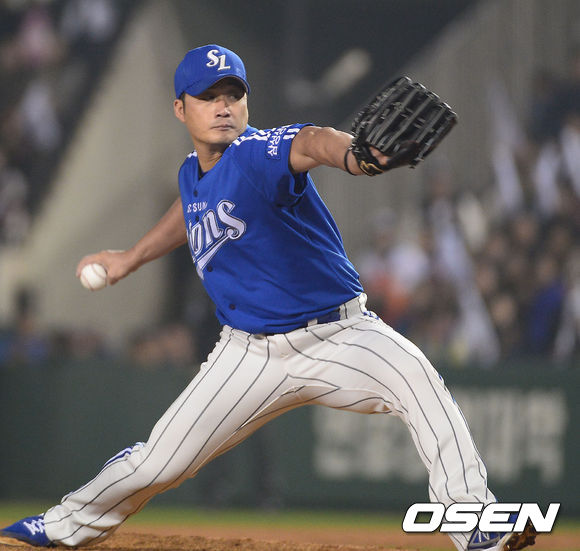 29일 오후 서울 잠실구장에서 열린 '2013 한국야쿠르트 세븐 프로야구' 한국시리즈 5차전 두산 베어스와 삼성 라이온즈의 경기, 9회말 삼성 오승환 마무리 투수가 역투하고 있다